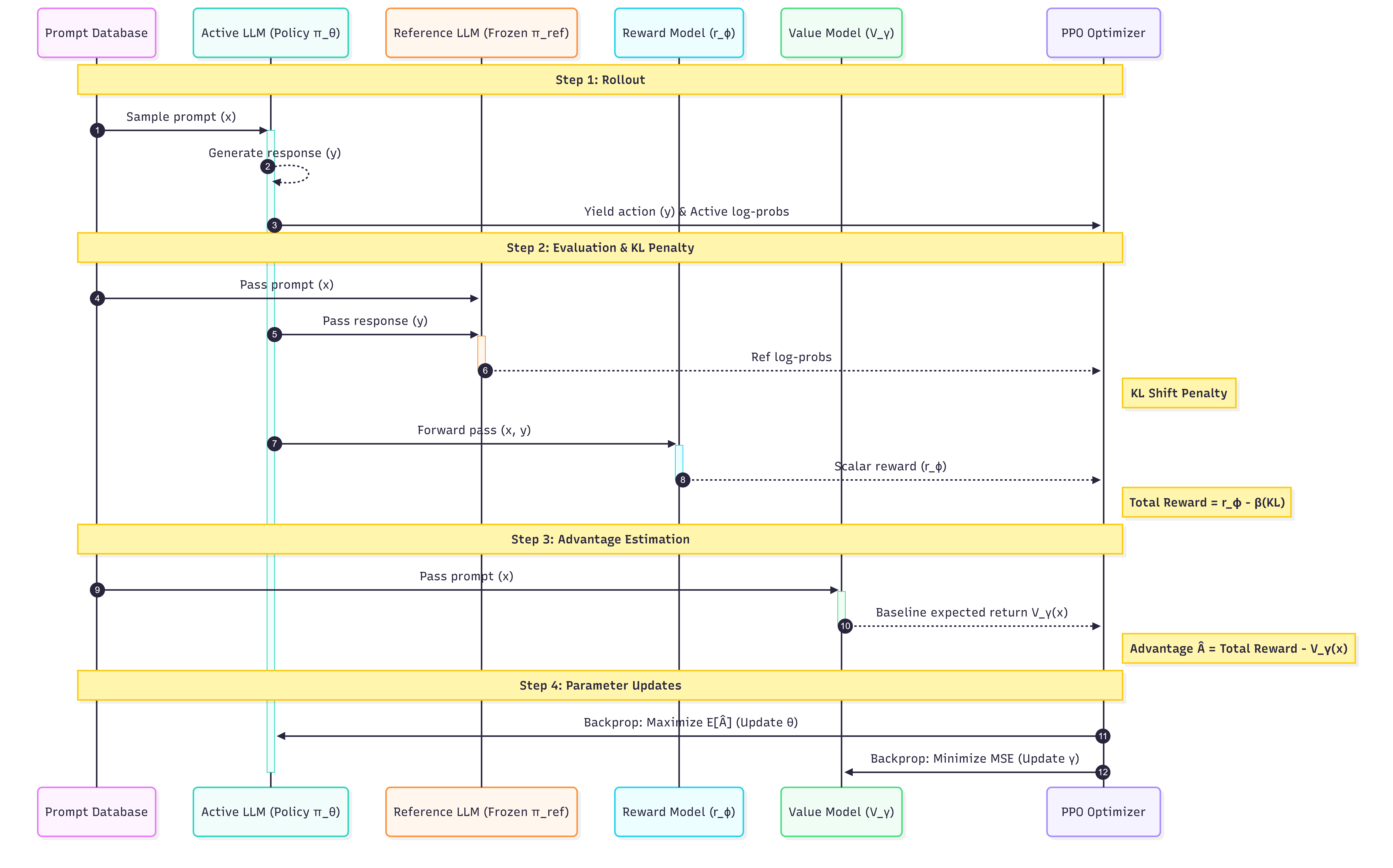 Step 4: Parameter updates. PPO’s clipped surrogate objective (Part 1, Section 4) updates the active policy parameters . The value model parameters are updated to minimize MSE between predicted and actual returns. The reference model and reward model stay frozen throughout.